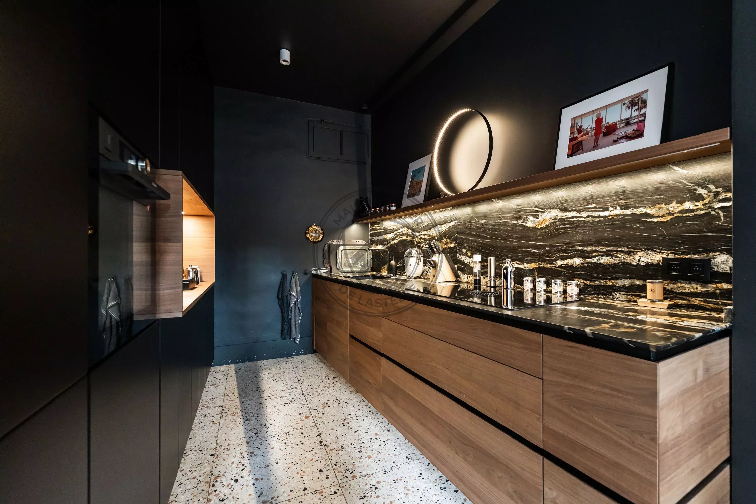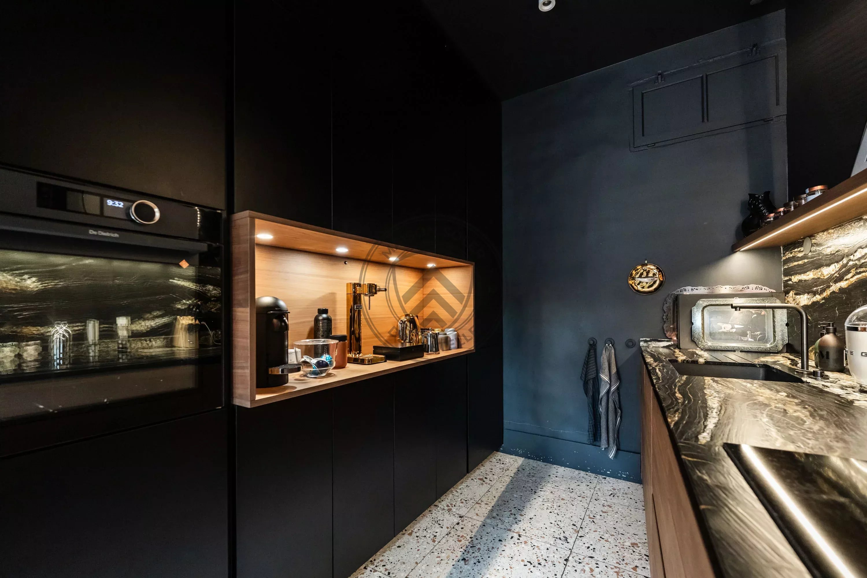 La cuisine, entièrement équipée, bénéficie de prestations haut de gamme : mobilier signé Poliform, hotte intégrée avec plaque à induction Bora, four et four vapeur Dietrich, réfrigérateur Liebherr, lave-vaisselle Electrolux avec système lift, plan de travail en granit et sol en terrazzo. Un espace à la fois esthétique, fonctionnel et parfaitement intégré à la pièce de vie.