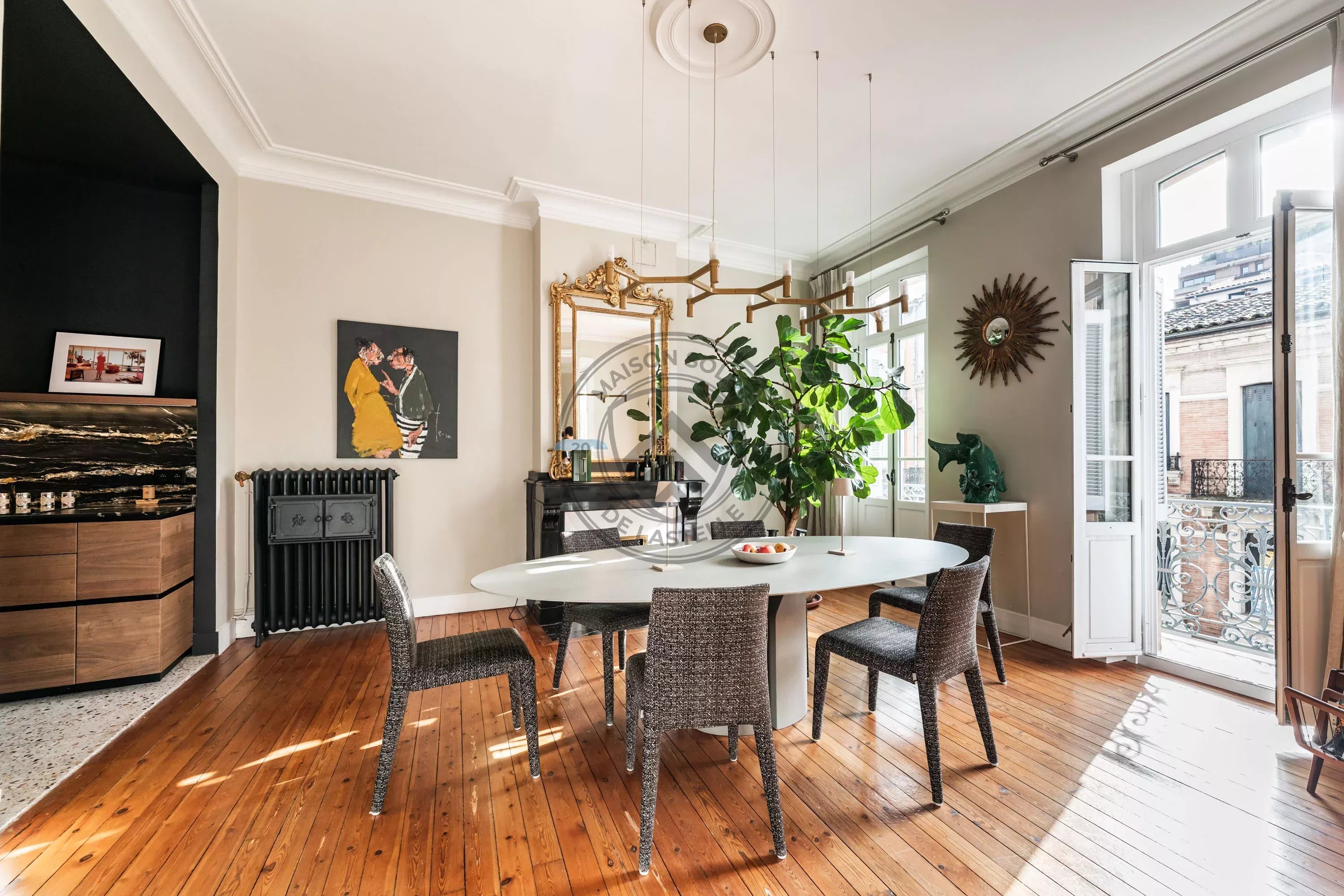 Le confort est assuré par un système de chauffage performant, avec radiateurs en fonte d’époque reconditionnés, alimentés par une chaudière gaz à condensation, complété dans le séjour par une élégante cheminée à l’éthanol.