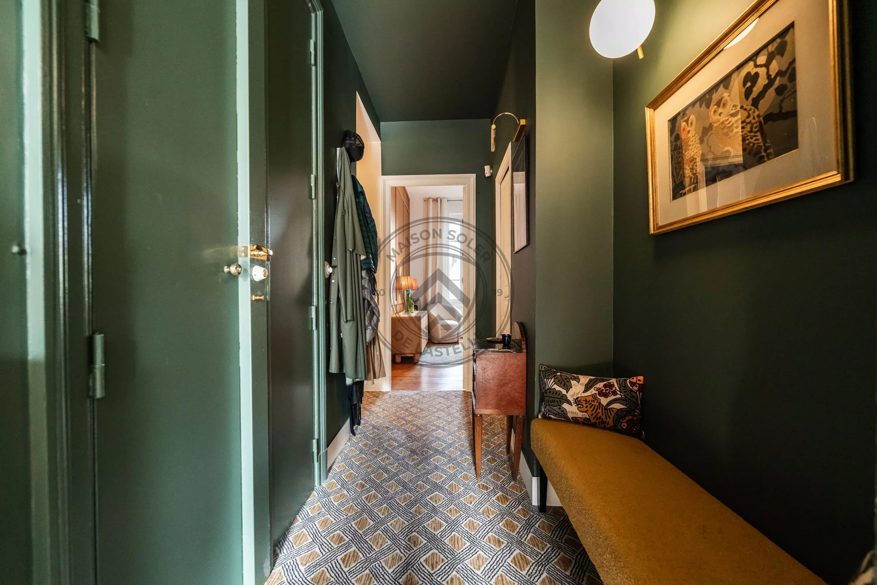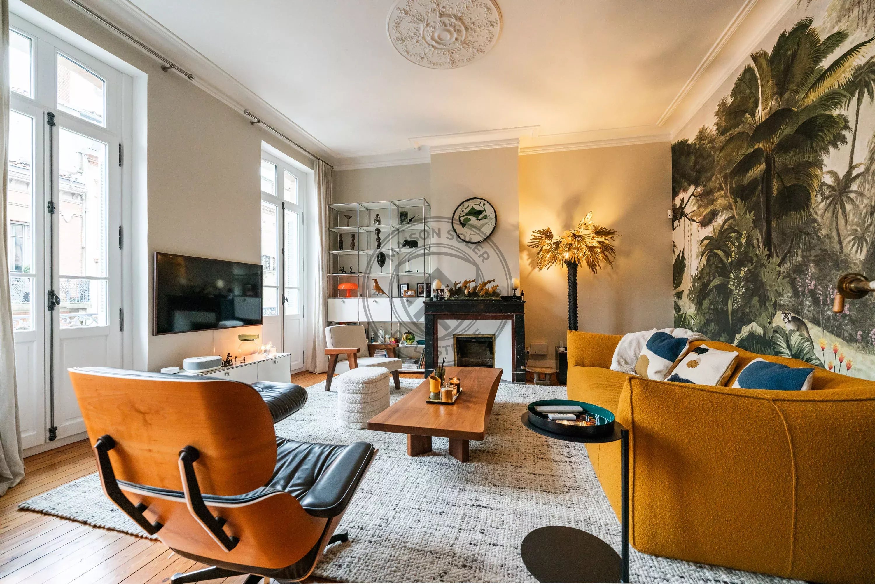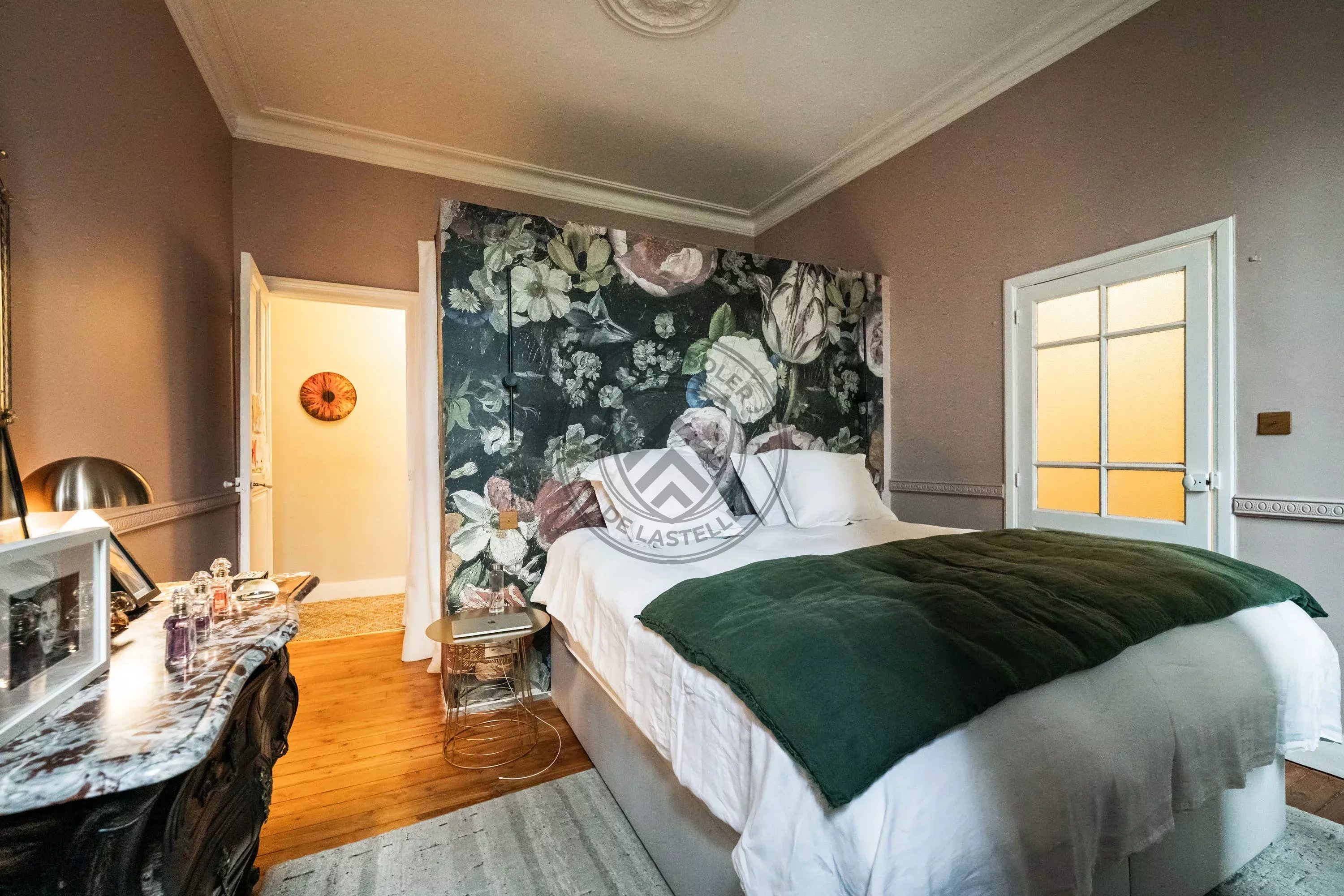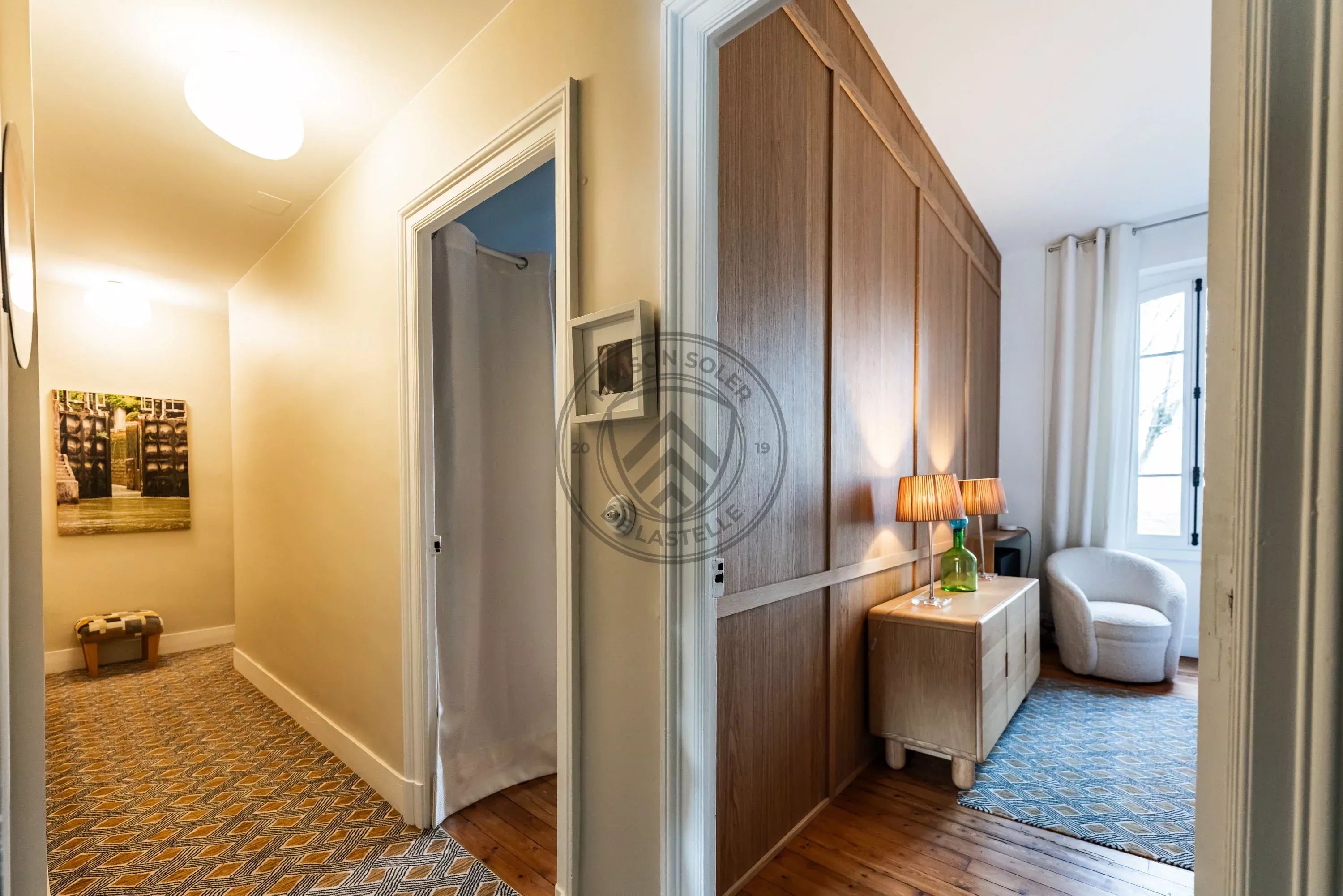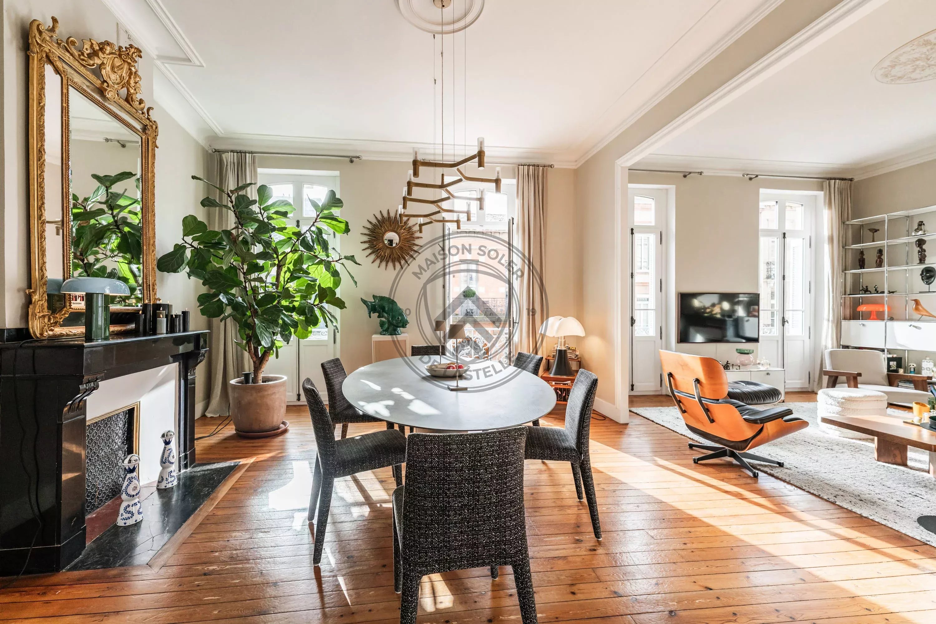 Dès l’entrée, les volumes impressionnent. Le double séjour, baigné de lumière, s’élève sous plus de 3,30 m de hauteur sous plafond et dévoile une atmosphère chaleureuse et raffinée. Le plancher ancien exceptionnel en pichepin, composé de lattes pouvant atteindre jusqu’à 5 mètres de long, apporte un cachet rare et authentique à l’ensemble. La moquette en laine signée Pierre Frey, soigneusement intégrée dans les espaces de réception, vient parfaire cette atmosphère élégante et feutrée.