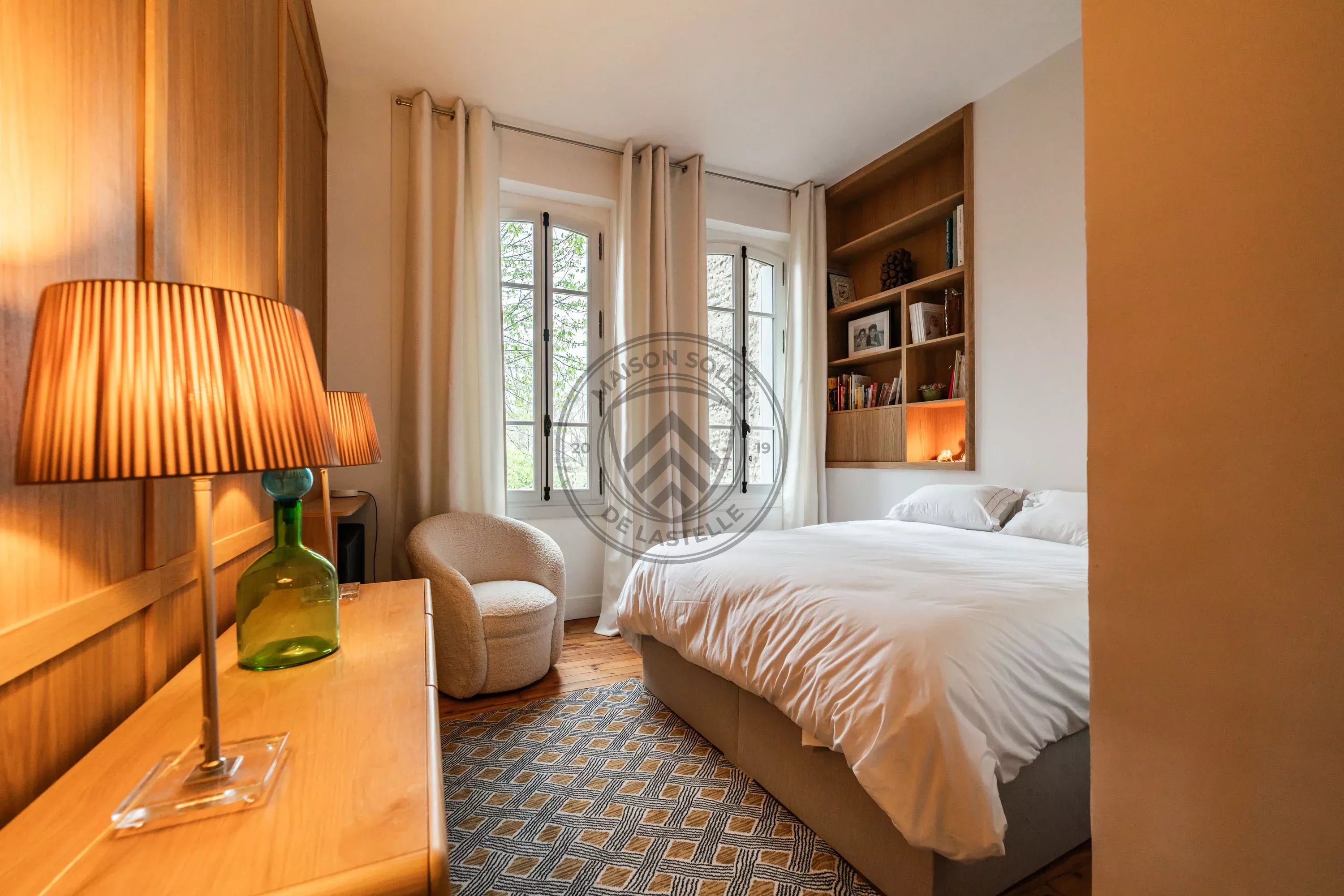 Côté nuit, deux chambres au calme, avec vue dégagée dans les arbres, profitent d’une atmosphère paisible, fraîche et confidentielle.